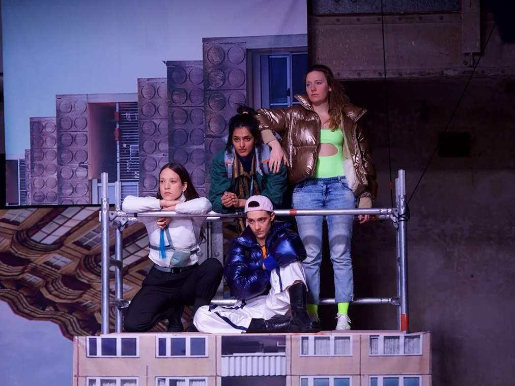 Dystopian suburbs of teenage dreams and nightmares. A group of girls meet. They dream of the future and share both individual and collective memories, oscillating between boredom and panic in the highly-planned architecture of their environment. Trapped amongst the remains of an urban nightmare built on earnest but misguided community housing projects, they wonder: Are there still possibilities waiting at The End of the Road? Cécile Bally’s social critique uses Sitcom-strategies to examine visions of radical change at the peripheries of urban life and transports the audience into an imaginary space at the borders of the city.